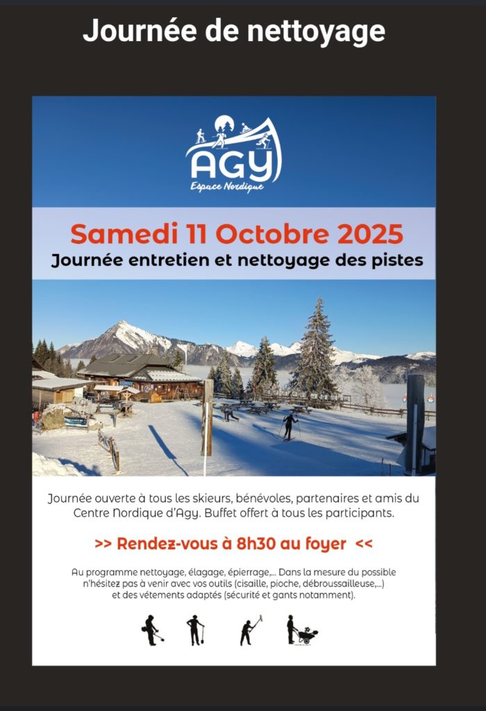 Samedi 11 octobre | AGY (Foyer) Tout le monde Journée de Nettoyage des pistes | – | AGY Séance à pied U12/U13 + tir 10m U14 à U20 |